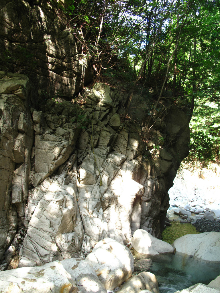 両岸とも切り立っているが、左岸の花崗岩の岩壁は圧倒的で、天に突き上げるような粗削りな岩肌が日に照らされてまぶしい。ゴーロの谷を上っていくと出合の暗い渓相に反して明るく花崗岩の岩肌に小滝とナメが連続して出てくる。エメラルドグリーンの静かな流れが美しい。