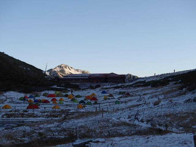 積雪する可能性は、天気予報で聞いていたのですが…。12日は、昼過ぎから小雨が降り出し、次第に氷が混ざり、夜は氷が降っていました。風も少々強く、テント泊するには心が折れそうになりました。小屋が空いていたら泊まっていたと思います。かなり混んでいたのと、テント場にも、結構テントが設営されていたので、テントにしました。