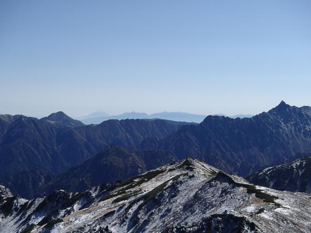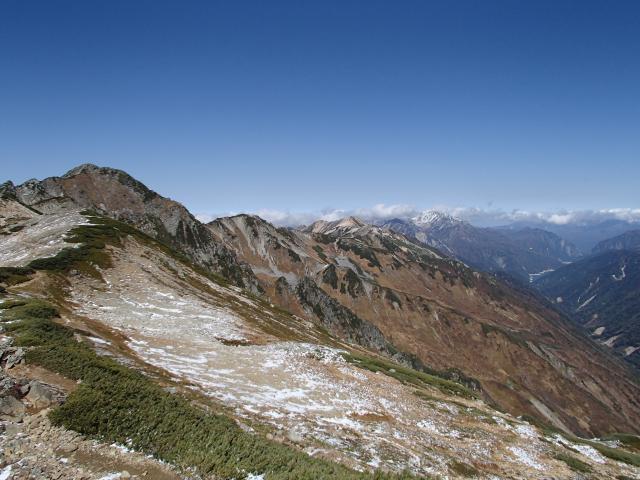 左奥の水晶はまだまだ遠い。その先の赤牛、剱、黒部湖。