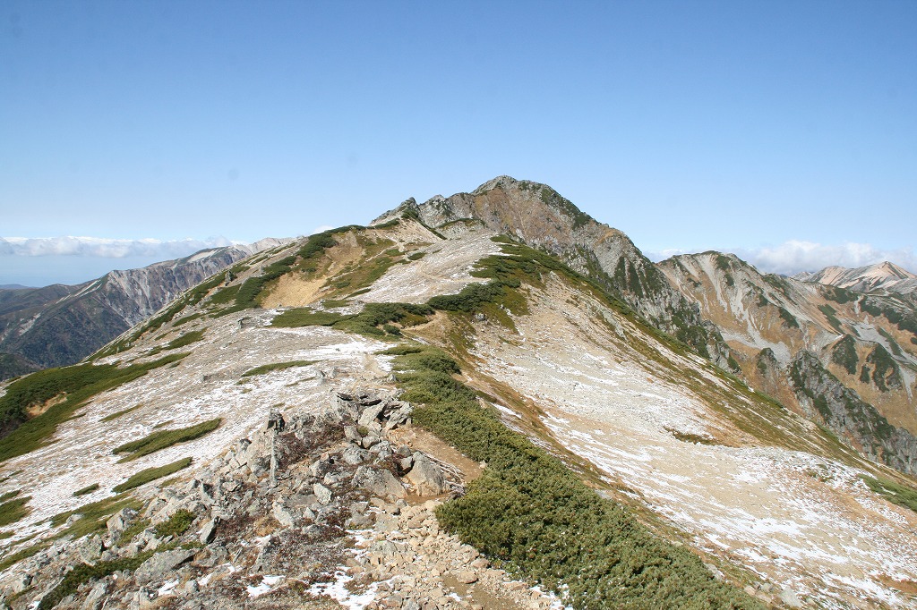 しかし北アルプス最深部を実感できるのは、行き交う登山者たちのザックがみんなデカイこと! いったい何泊するんだというくらい細い身体に似合わない大きな荷物を背負った山ガールから、私の日帰りザックに注がれた目線が痛いほどだ。(^^;最近はそういう(越前さん)みたいな人をよく見るようになりましたね。後立山の不帰の険でも会いました。しかも外人。