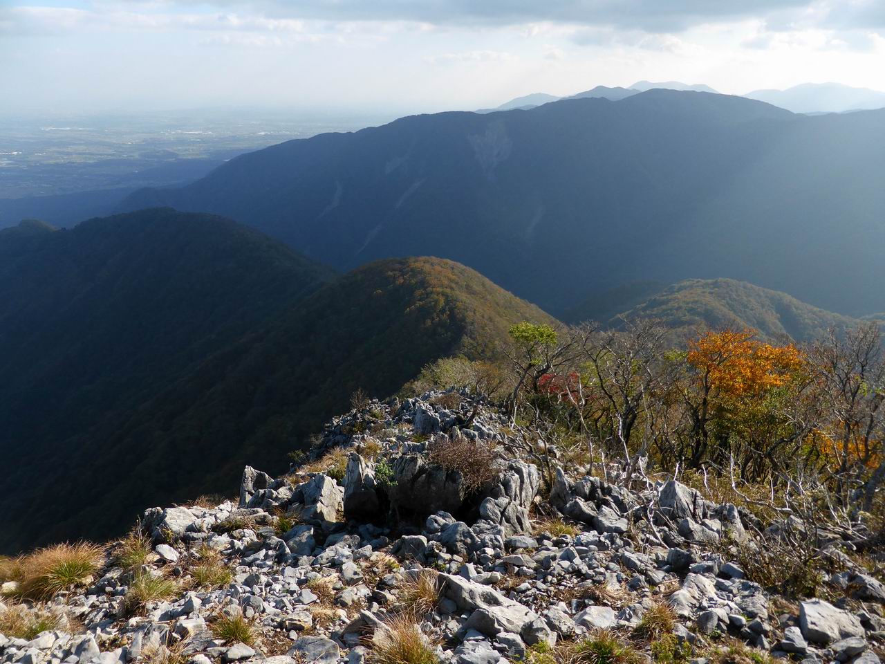 ることにした。天狗岩からは、藤原岳の紅葉が見え、さらに登ってきた西尾根、その向こうに迷い尾根が見える。さらに県