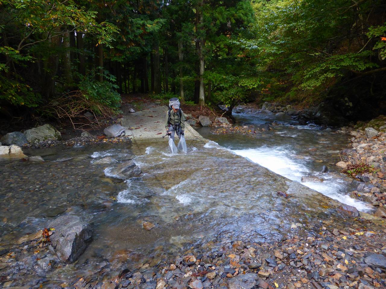 出発は7:30となった。林道を歩き始めると、すぐに小さなコンクリート縁堰の渡渉があり、これは駆け足で渡ることができ