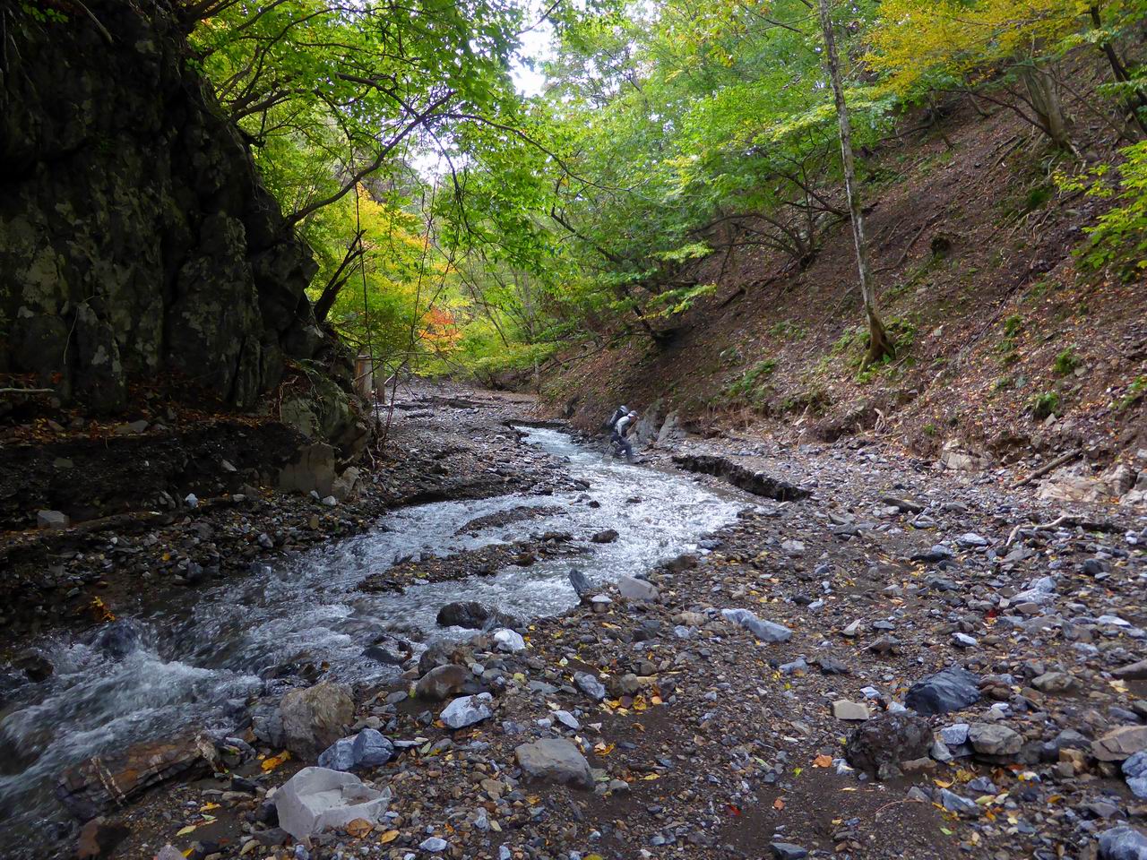 って下降していく。テープもあり、道としてははっきりしている。やがて小さな支谷に降り立った。この谷の左岸沿いに踏み