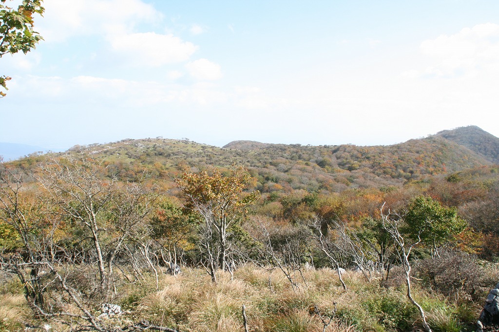 がて傾斜が緩やかになってきた頃、左手の眺望が開け、正面に藤原岳展望台(1140m)が見え、山肌が紅葉している。