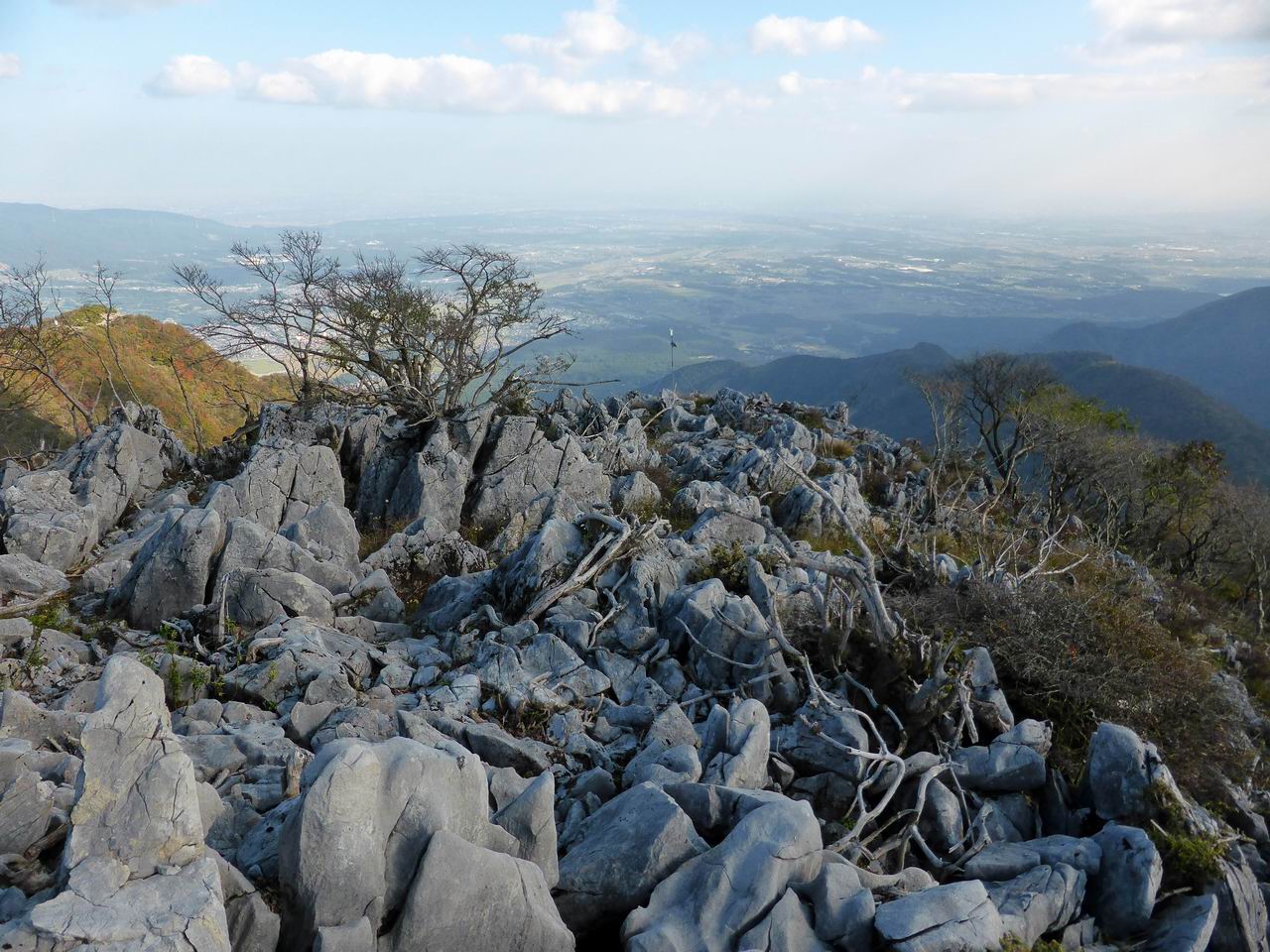 台の先からは石灰岩のゴロゴロした尾根を急降下だ。慎重に下る。石灰岩がなくなってもまだ急降下が続く。登山道は少