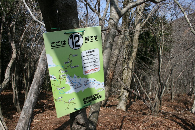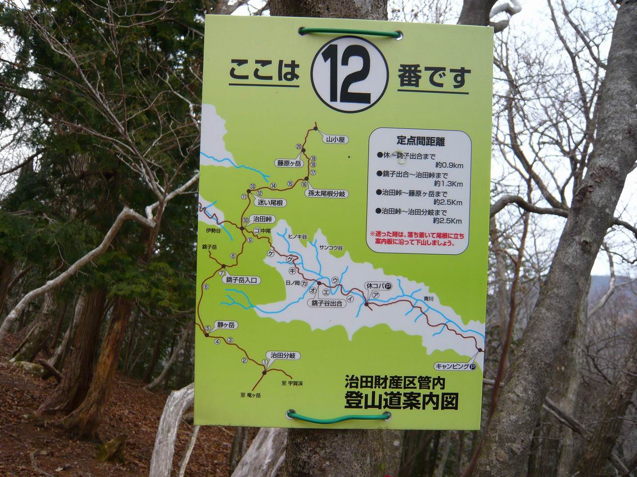 2012年の4月に孫太尾根を上がり帰りは青川峡を下ろうと治田峠に来ました。もちろん、12番プレートで曲がり、11番プレートも通過しました。