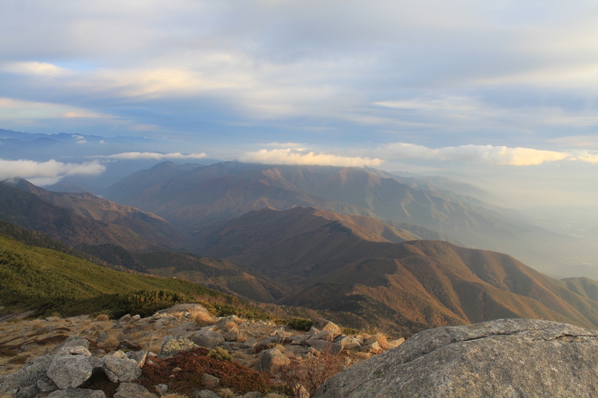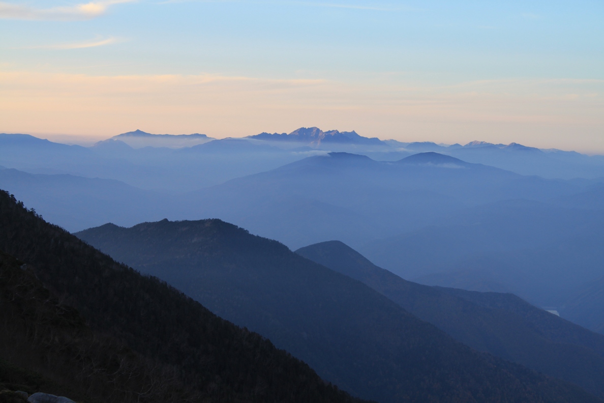 ます。南に伊那前岳、宝剣、木曽駒、右手北側には茶臼山方面の山々が、そして前方に今日の
