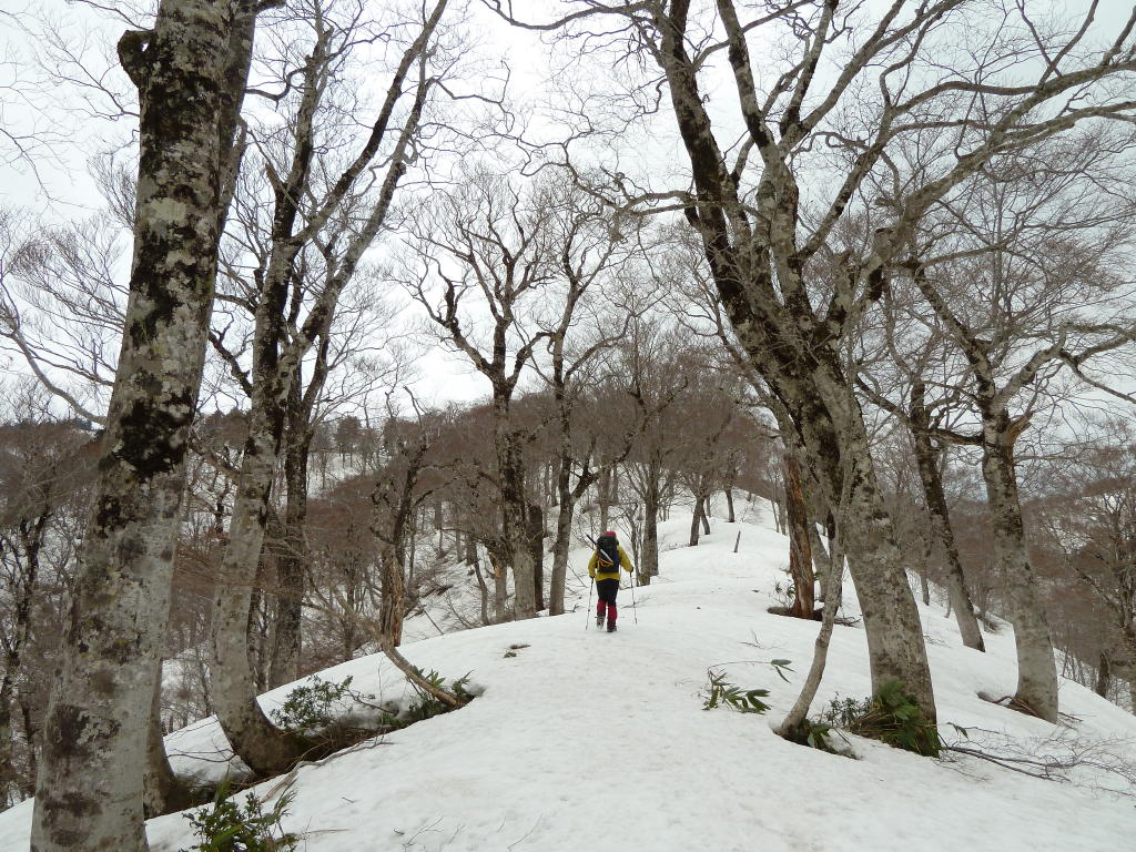 ポイントだったが、ヤブはすべて雪の下。ブナの疎林を一歩ずつアイゼンを利かせて登るだけだ。