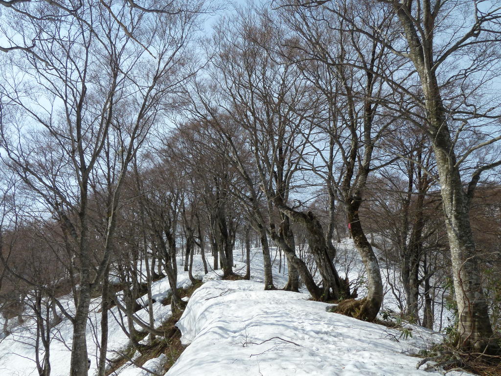 切り開きが終わってホンの少しヤブを漕げば、期待通り雪が繋がった。ブナ林が始まる1267m標高点からの急登のヤブが最大のポイントだったが、ヤブはすべて雪の下。ブナの疎林を一歩ずつアイゼンを利かせて登るだけだ。前回はヤブに気を取られてあまりわからなかったが、この急斜面のブナ林もなかなかのものである。