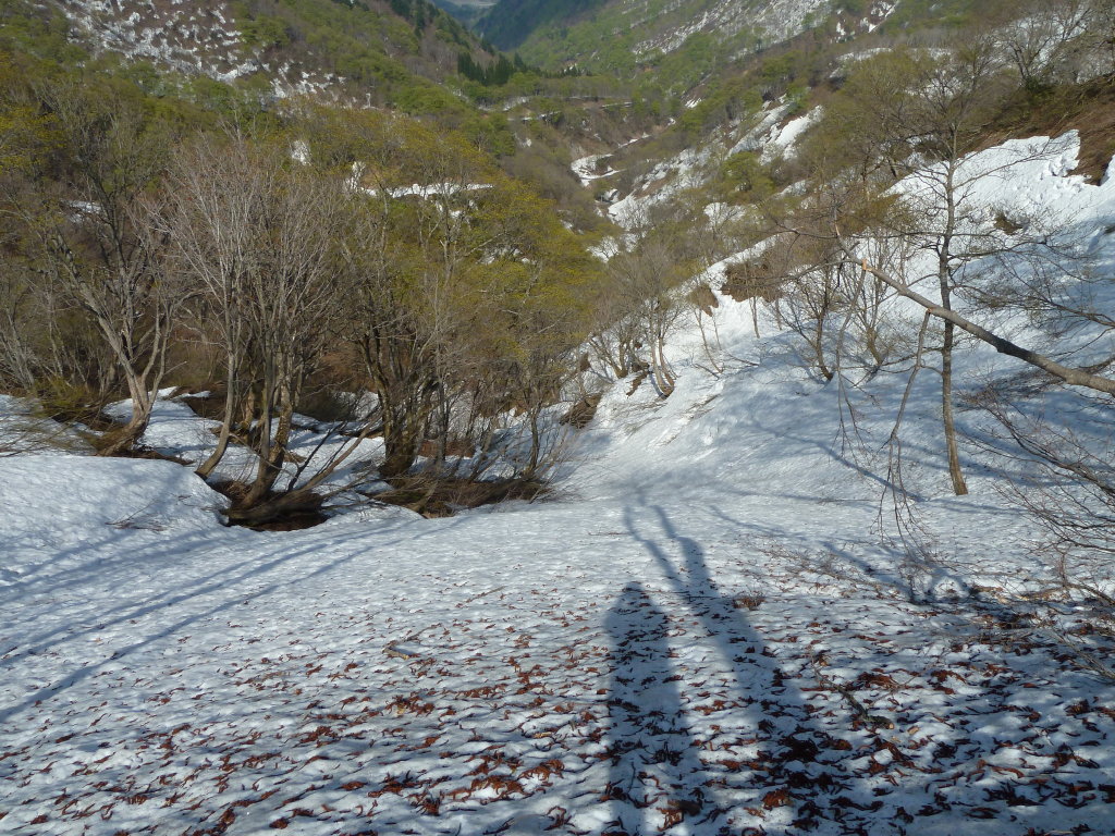 >開津谷の源頭は滑ったら気持ちの良さそうな大斜面が広がる。このまま尻セードで飛び込んで標高差200mばかり滑り