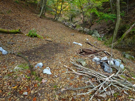 すぐに焚き火の跡とテント泊の跡らしきを認めた。