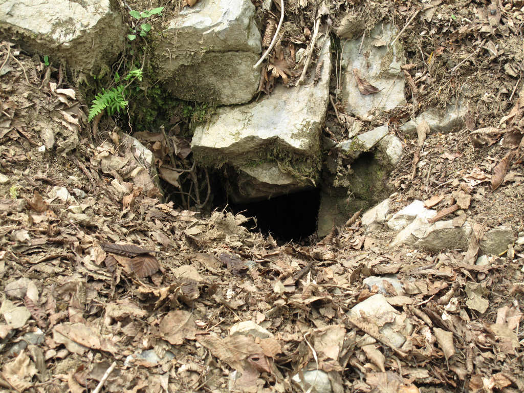 笹原を歩き羽瀬尾への降下地点に向かう。目星をつけたのはテーブルランドから多志田谷に向かい南東に下りている尾根で、かなり急な下りだが、少し下れば木が生えているので怖くはない。木と岩をつたいながら下りていくと、尾根らしくなっていく。すると岩クラが連なっている。岩クラの前が大きく開け大きいスペースが作れるエリアがある所など添水銀山とよく似ている。岩クラを探っていくと水抜きの穴を発見。その前には目印となる古木もある。