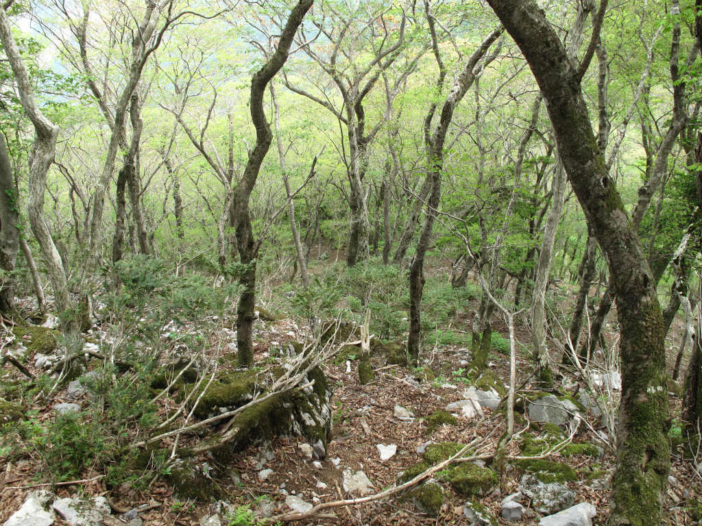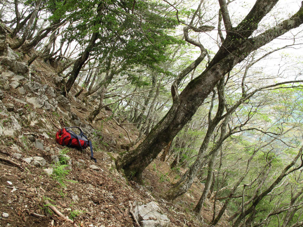 笹原を歩き羽瀬尾への降下地点に向かう。目星をつけたのはテーブルランドから多志田谷に向かい南東に下りている尾根で、かなり急な下りだが、少し下れば木が生えているので怖くはない。