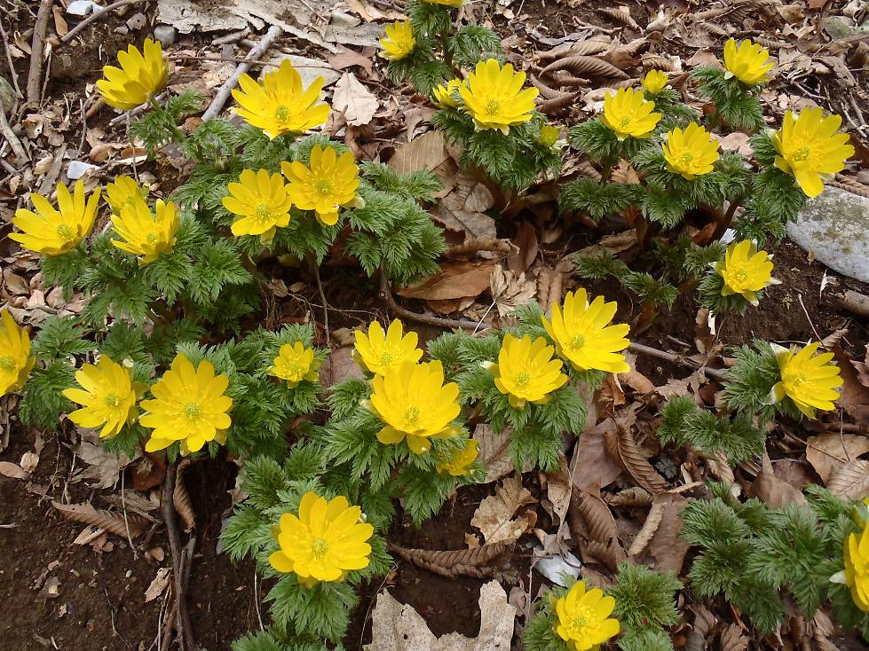 ぽつぽつと福寿草が咲いている。遠くから登山者の声が聞こえてくる。