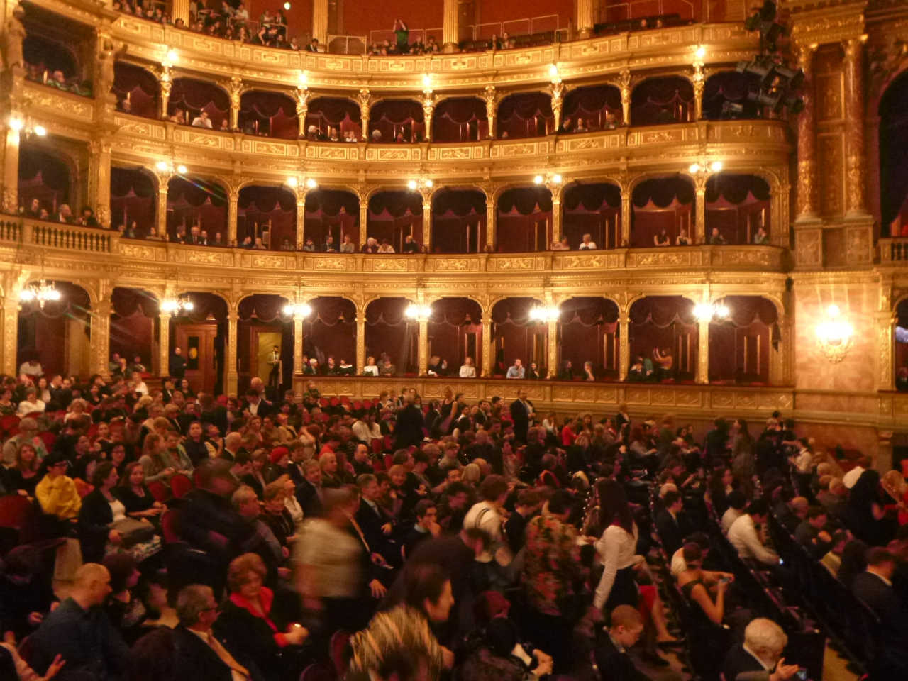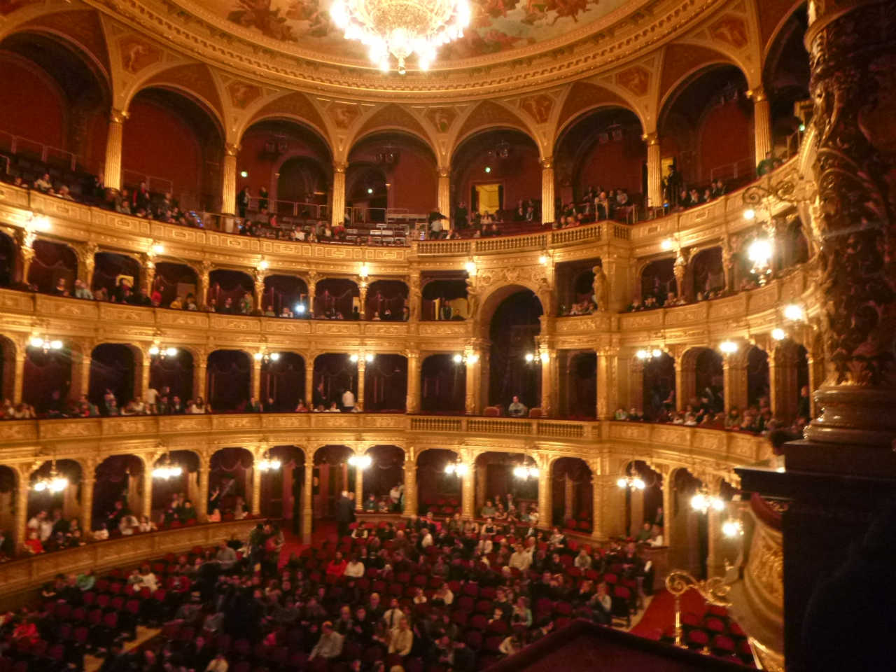 温泉から帰った後,夕方7時から始まるバレエ公演「オネーギン」を見に国立オペラハウスへ行く.2013年末にベルリンからハンガリー国立バレエ団にプリンシパルとして移籍してきた中村祥子さんが主役のタチアナを演じるのだ.中村祥子さんはバレエに詳しい人は知らない人がないほど有名な方なのだそうで,海外で活躍している日本人バレリーナとしては最も有名な人らしい.私はブダペストに来てから初めて名前を知ったのだけど.席はいつもの4階の天井桟敷席で1200フォリント(約500円).天井桟敷でももっとも舞台に近い席なのだが,目の前の大きなスポットライトが邪魔をして,手すりに座って見ないと舞台が見えない席だ.中村祥子さんの舞台なんて日本ではまず見ることができないし,そんな舞台をわずか500円の入場料で見ることができるというのはブダペストにいるからこその贅沢というものだろう.
