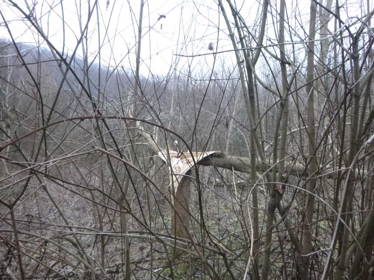 歩き始めると木々の幹や大枝が裂けたり折れたりしているのが目立つ.これは昨年12月初めのアイスストーム(氷嵐)によるものだ.zippさんが指摘した通り,強風によって着氷した木が折れたもののようだ.山を歩いているとこのアイスストームによる樹木破損の被害がハンガリー全土で非常に大きいものであったことがわかる.ハンガリー人に聞いてみるとこのような甚大な被害はそう頻繁にあることではないという.幸い,この出来事から1ヶ月以上経ち,トレイルコース上の倒木はきれいに整理されていて,歩きに支障はなかった.このようなトレイルコースの整備は,ブダペストではブダペスト市がやっているようだが,かなりの費用がかかっているのだろう.