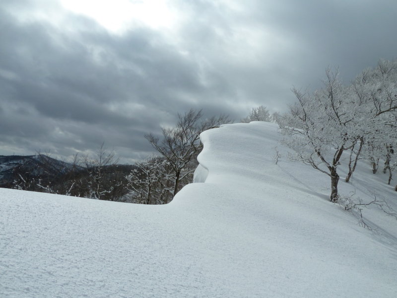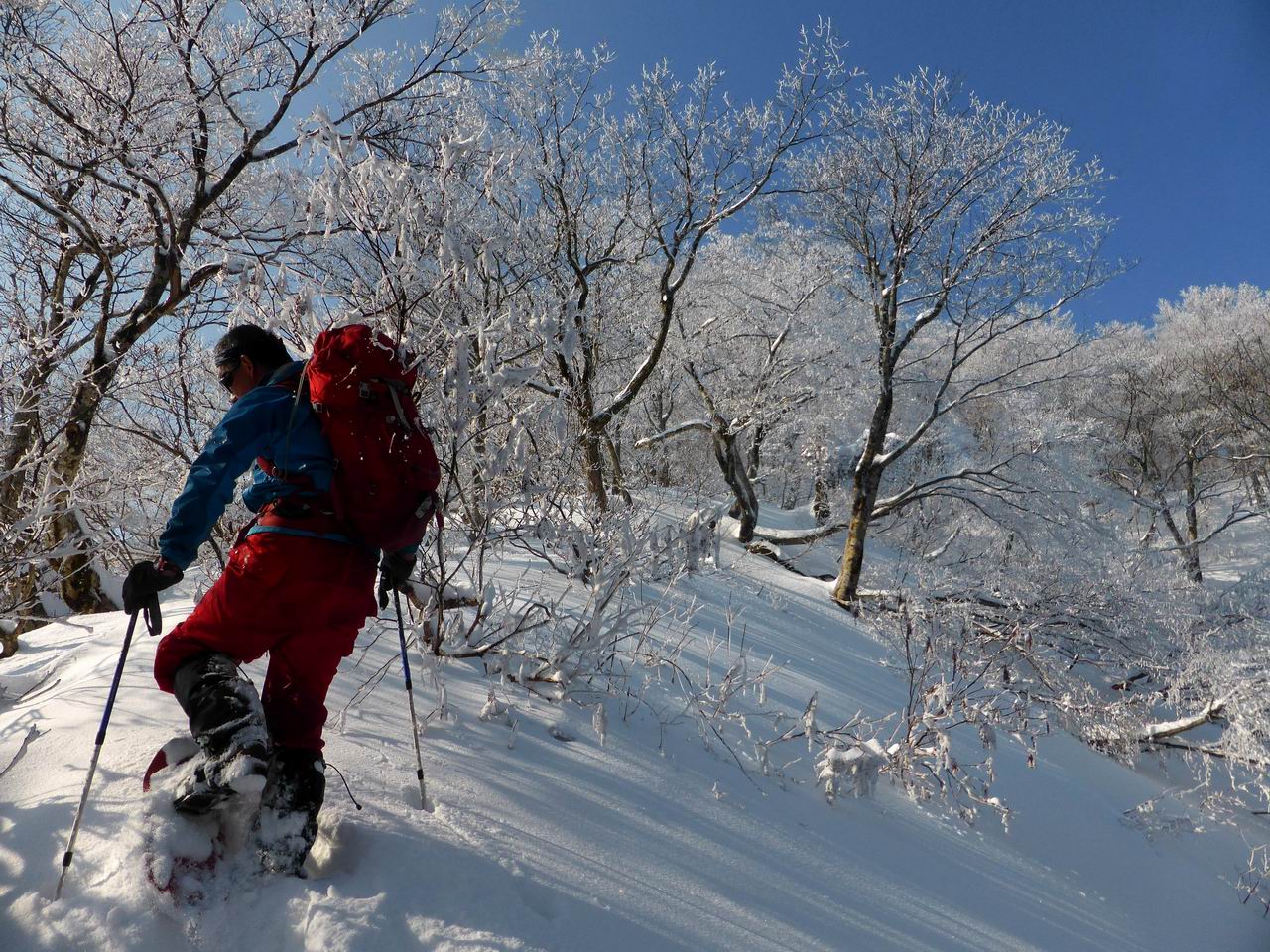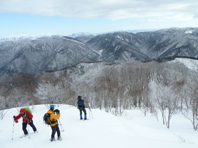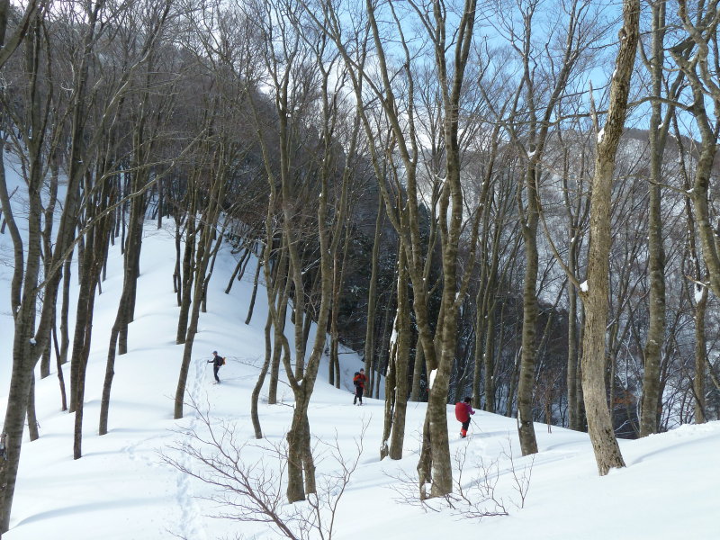 芦谷山から延びる北東尾根は自然林が広がり雰囲気がいい。途中でラッセルを交代して先頭に立つが雪が湿っていて重い。