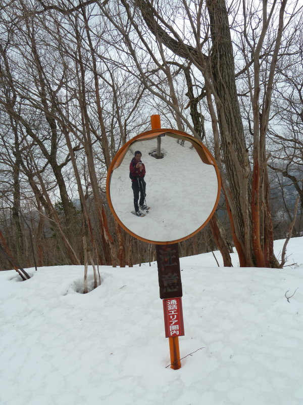 林道に出るとヤマドリ♂が飛び立った。カーブミラーは鏡のところしか出ていない。今年は積雪が多いとのこと。