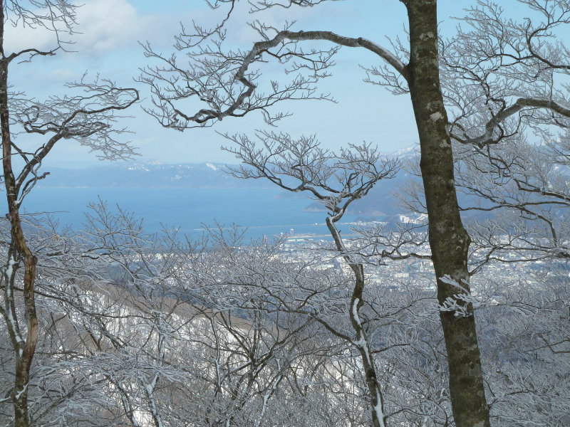 山のすきまから琵琶湖や、左手には敦賀湾も見える。この時期の日本海側でこんなにクリアなのは珍しい。
