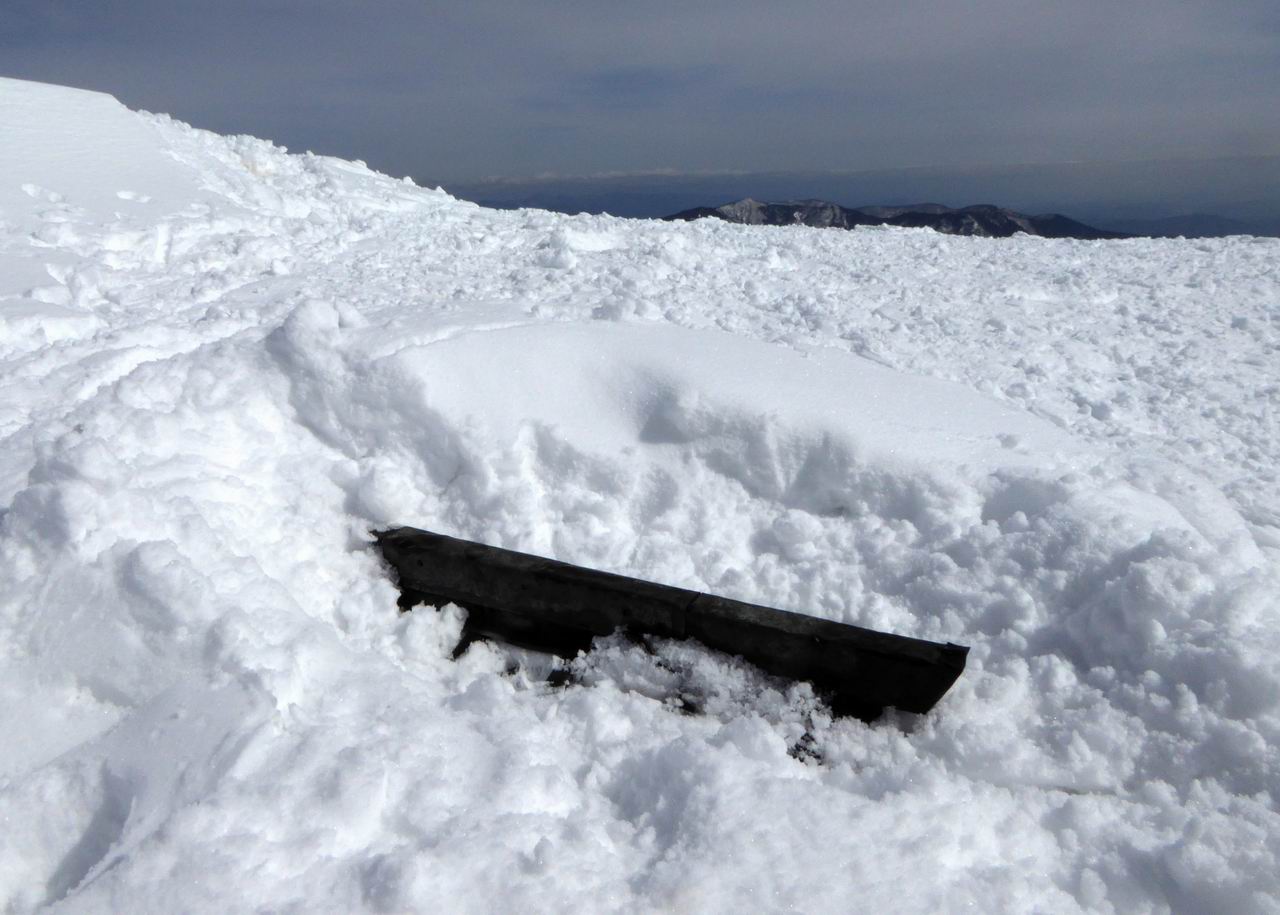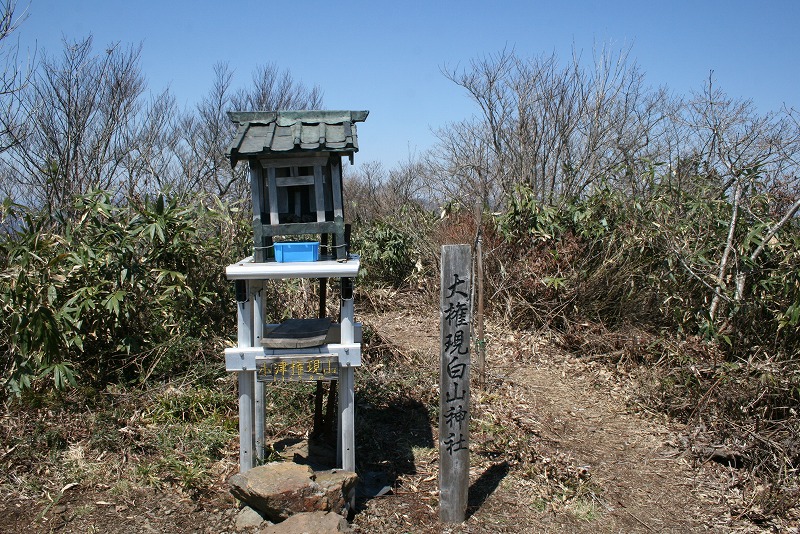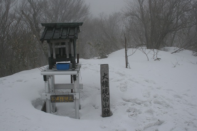 そうだ、山頂には大権現白山神社の祠があるはずと探してみるとありました。屋根の先だけがちょっとだけ露出している。この祠の地上からの高さは人の丈くらいだから、積雪量は150㎝余りというところであろうか。