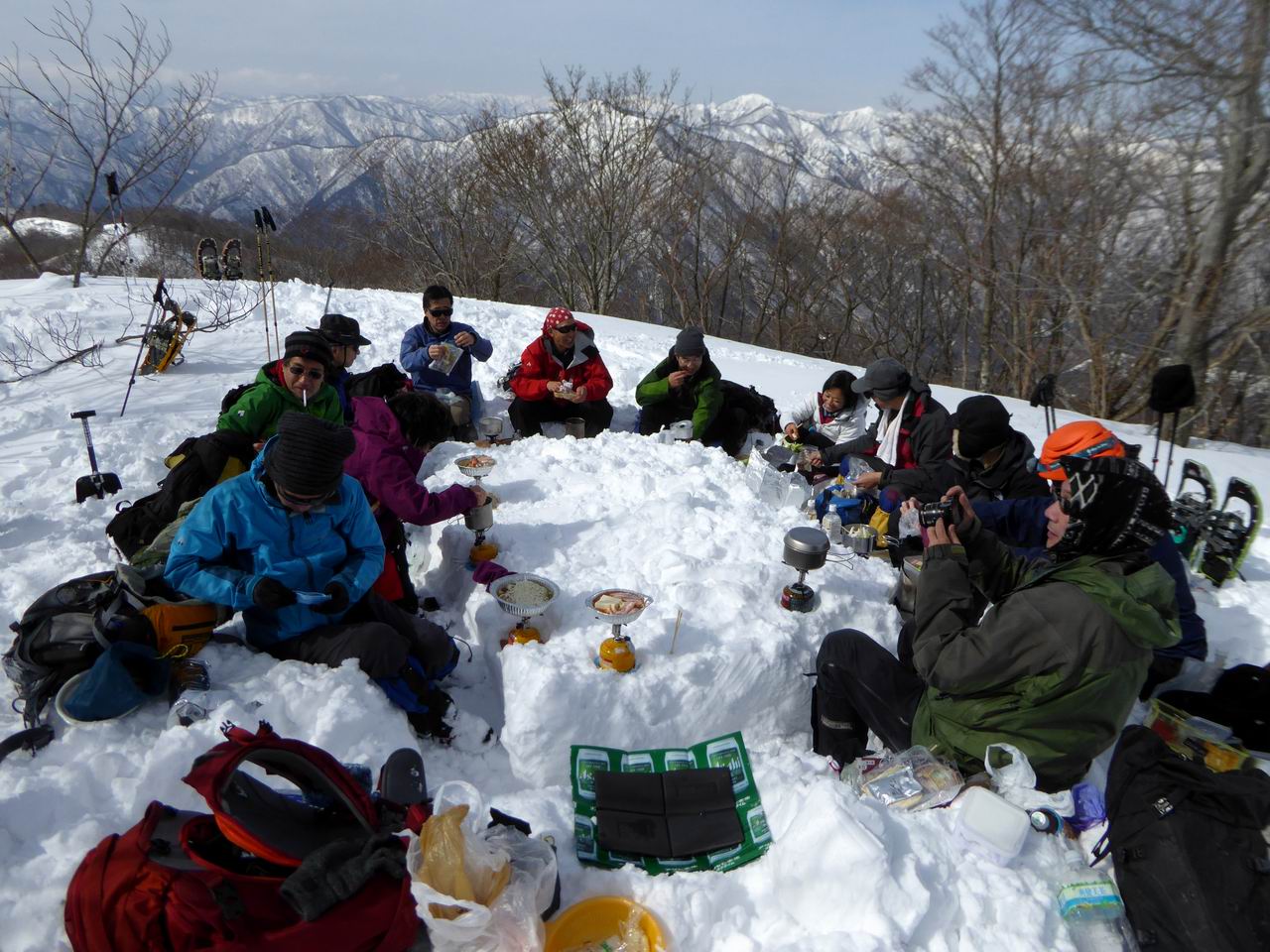 山頂はそれなりの広さがあったものの、ランチ場所としてはもう少しよい場所があるということでは少し引き返した。藤波コースの分岐点ところだ。スノースコップでテーブルを作る。今日は総勢13名ということなので少し大きなテーブルを作った。そして、いつものように楽しいランチタイムのスタートだ。めいめい持参した鍋を広げて煮炊きの開始である。やはりアワワは欠かせない。風もほとんどなく、太陽の下、ぽかぽか気分でワイワイがやがやと過ごすひとときはスノー衆ならではのものだ。