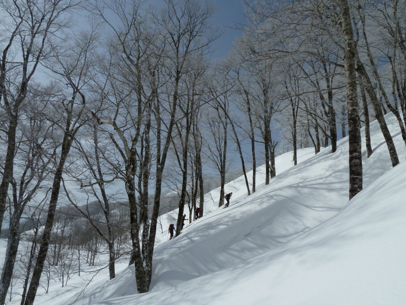 休憩後は下山を開始します。 予定通り東の尾根を1153m峰へと降りていきます。 1290mまで降りると、南斜面が緩やかになり、そちらへ降りると雰囲気の良いブナの平坦地となっていました。 山頂の風が強い場合は、こちらで休憩の予定だと聞き納得です。