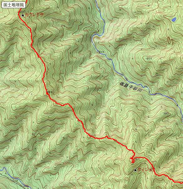 ここは、完全に地図を読み違えましたね。尾根の発生が、パッと見た感じよりももっと早かったということでしたね。その先で尾根が二分するが、蓼畑に下るには尾根の中間にある尾根に乗り換えなければならない。確認が不十分なまま右手の植林を下っていったが、GPSで確認すると案の定右手の尾根に乗ってしまっている。