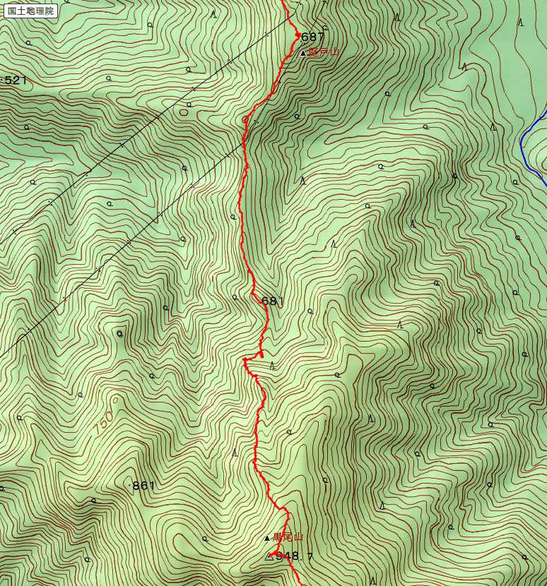 出発して、しばらくしたら二分する尾根を右の尾根に辿り、その後で出て来た左の尾根に乗り換えればよいと地図を読んだのだが、それが間違いであった。歩きながらの地図読みで、微かな出っ張り(それはすでに尾根筋だった)が、もっと早い段階で発生していたことを見落としていたのだ。要するにca.600mの最初に尾根が二分するところで、この時すでに右ではなく左の尾根に乗らなくてはいけなかったのだ。しばらく行く内に、途中から乗り換えるはずだった左の尾根が、すでにずいぶん発達したものになっていることに気が付く。その目指す尾根が、疲れた身にはずいぶん遠くのものに感じる