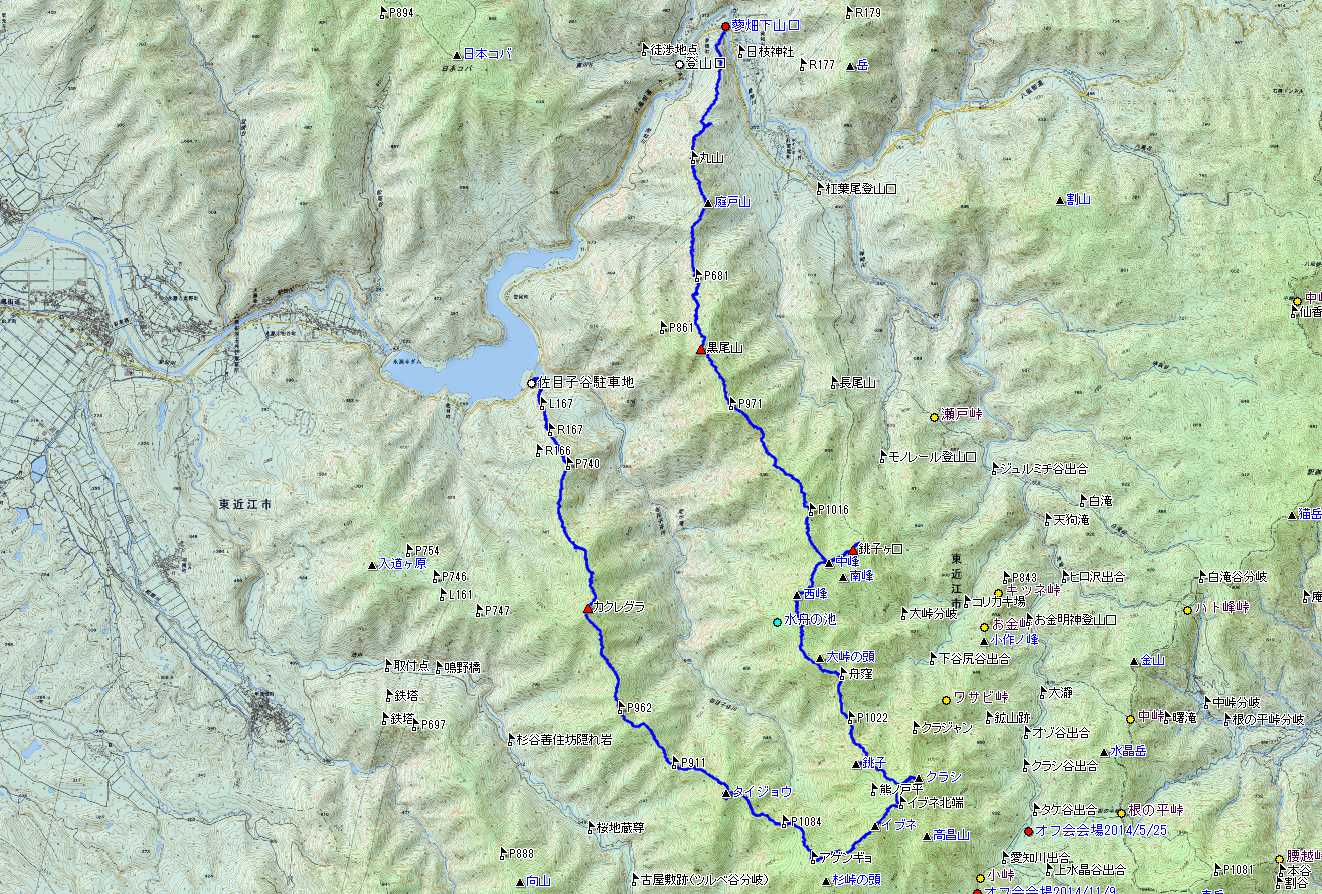 分岐から黒尾山をめざすが、道は踏み跡程度になってきたが、テープがつけられている。左手に植林の多い尾根をアップダウンしながら次第に高度を下げていく。やがて870mの鞍部から100mの登りとなるが、この途中はヤセ尾根で左側が切れ落ちているところだ。ここは樹木の根や枝をつかみながら登っていけば、そう怖がるところでもない。時々佐目子谷を挟んでカクレグラやタイジョウ、そして雨乞岳や綿向山の頭も見える。ガレ場の急登を登り切るとP971で平坦となってくる。ここからは緩やかに登って下ると黒尾山(948.7m)に到着した。展望はないが、三等三角点と山名プレートがあった。ここで時刻は15:50なので午後5時には蓼畑に下山できるだろうと思っていた。しかし、これが誤算であった。黒尾山からは庭戸山と丸山を経由して北尾根端の蓼畑に下るのであるが、実は地形図を見ると黒尾山からすぐのところとP681の手前と丸山を過ぎたところの3箇所で尾根の乗換があり、これをうまくクリアできるかどうかがポイントだった。最初の黒尾山を過ぎた直後の切替は難なくスムーズに進んだ。問題はP681の手前の乗換であった。急な尾根を下りながら少しずつ右に切っていき等高線が少し広がったところで切り替えるところ、少し下りすぎてしまい、途中で右手の尾根にトラバースしなければならなかった。この斜面も急で滑落するのではないかと心配したが、予想外にトラバースの足場が安定していたおかげで何とか尾根の乗換がうまくいった。そのままP681に登り返すと、そこからは平坦な尾根道を進み鉄塔に出た。右にはR421を挟んで竜ヶ岳と不老堂、水木野(割山)が見え、左には永源寺ダムが見える。さらに尾根沿いに進むと次の鉄塔が庭戸山(687m)であった。鉄塔越しに岳(781.2m)が見え、その向こうには御池岳、藤原岳、静ヶ岳、竜ヶ岳の姿も見ることができる。
