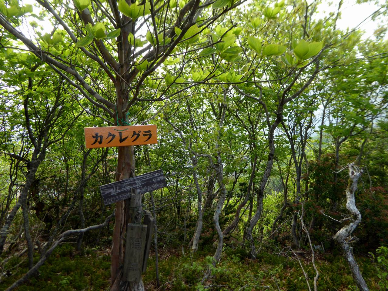 カクレグラには、4回目の登頂。過去3回はいずれも渋川側から。はじめて佐目から登りました。あまり人が通らない道と想像しますが、その割に歩きやすい尾根道でした。カクレグラ近くは雰囲気のいい明るい2次林でした。