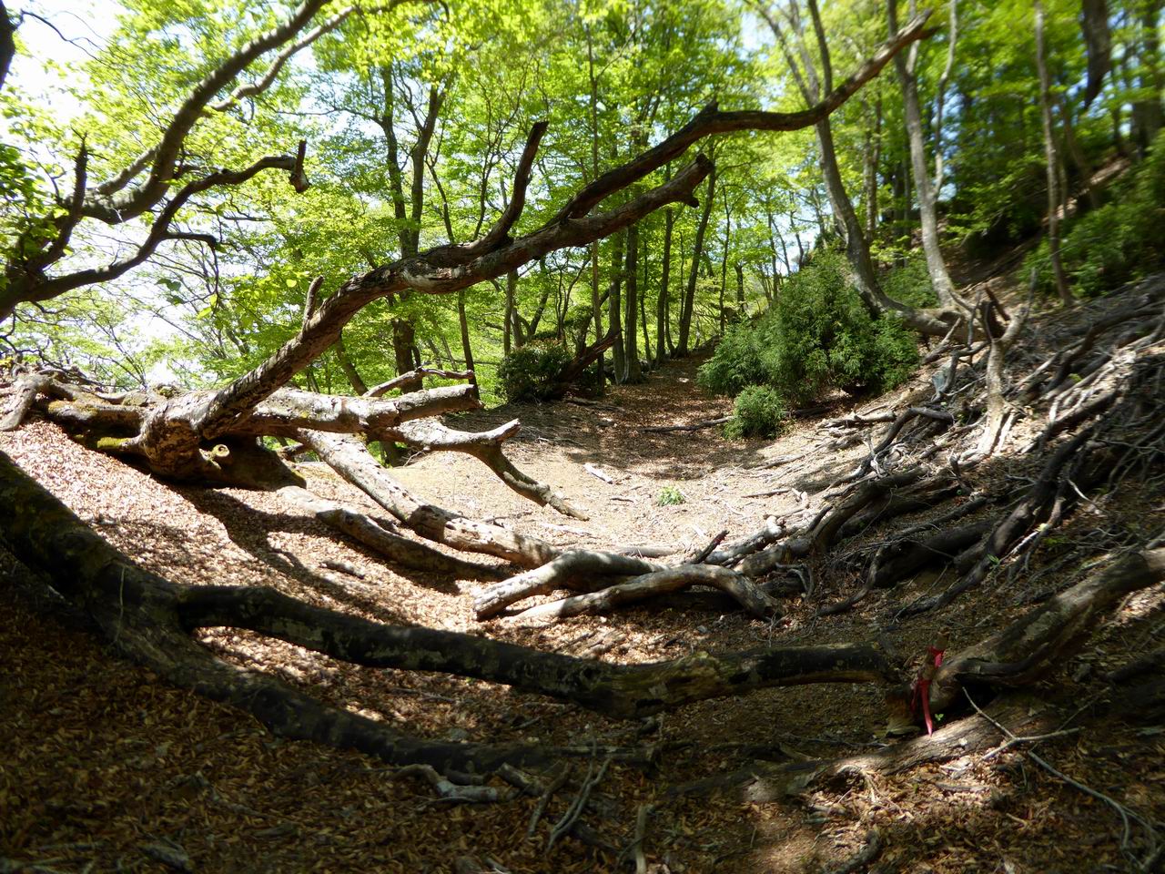 まずは、杉峠の頭北西端に向かう。そこまでも新緑に輝く気持ちのよい森が続く。この辺りはずっと下草もなく、本当に素晴らしい天然公園だ。こんなところを歩いていると、人が作った人工の公園や森にお金を掛けて行くのは実にバカバカしいことのように思える。