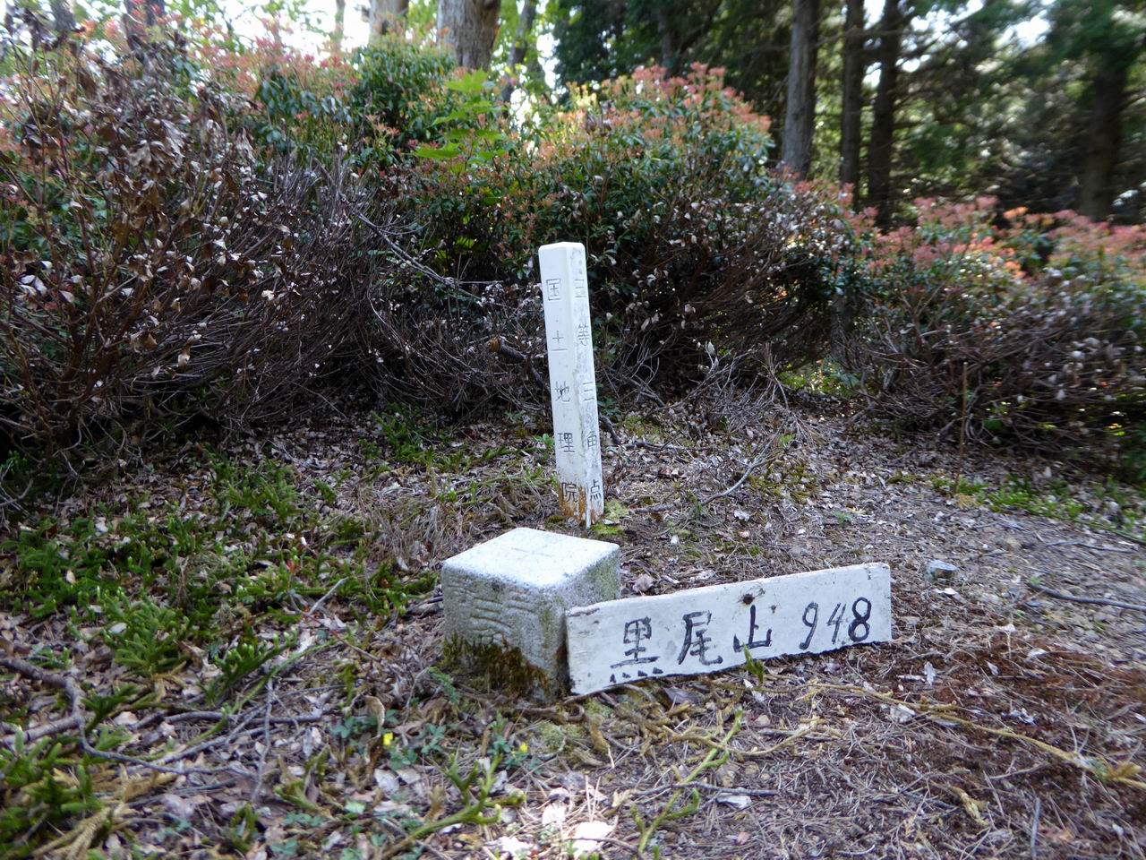 標高点971mの少し前で、ようやくヤセ尾根を抜けると、平坦な自然林の森が続く。黒尾山の手前で少し下り、登り返して黒尾山(948.7m)に到着する。