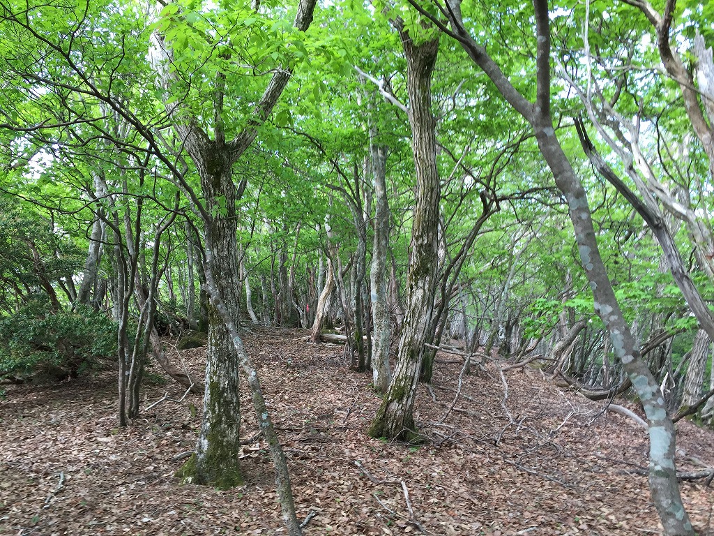 新緑の気持ちのよい2次林が緩やかに続くようになるとカクレグラの山頂も間もなくだ。7時52分、標高990.3mのカクレグラ山頂到着。展望があるわけではないが、小広い山頂には真ん中に三角点が鎮座している。何とかここまで辿り着いたら、ここから入道ヶ原を回って下りようと思っていたが、どうやら今日一日何とか歩けそうな気もする。元々私自身が歩きたいコースでも有るので、更にタイジョウまで行ってみることにする。みんなには、「やっぱり行くんでしょ。」と冷やかされながらも、少しでもみんなと一緒に行きたいばかりだ。