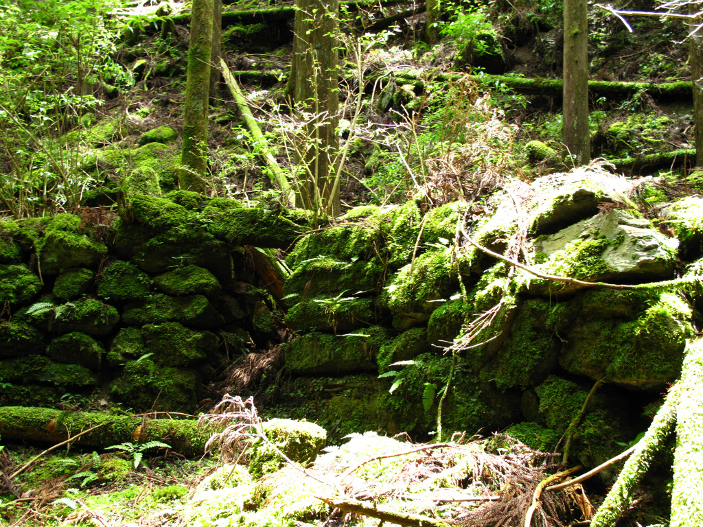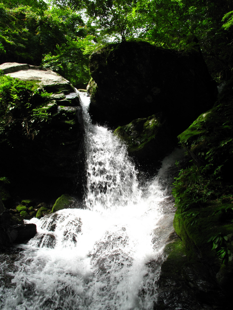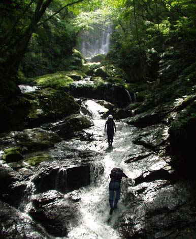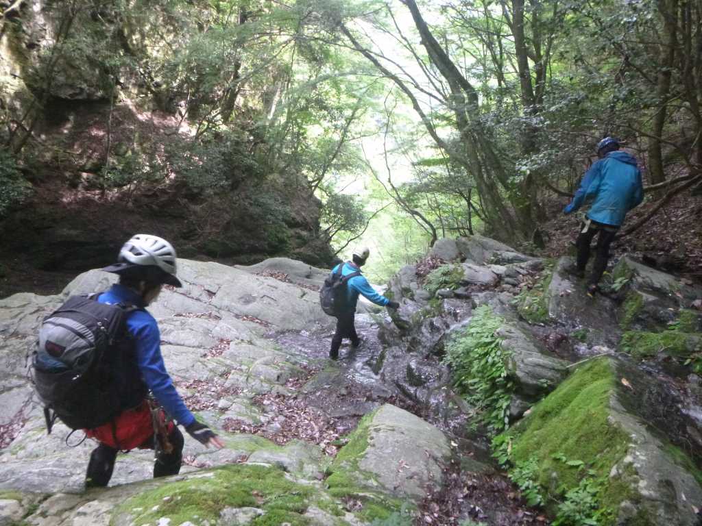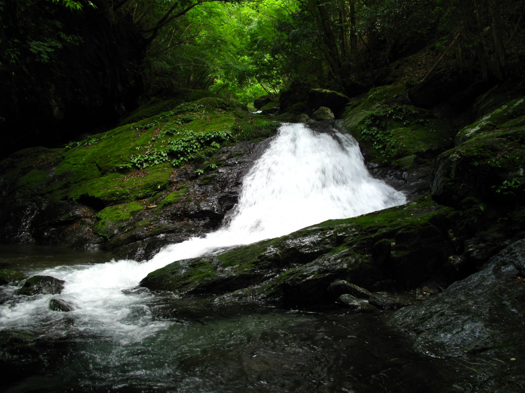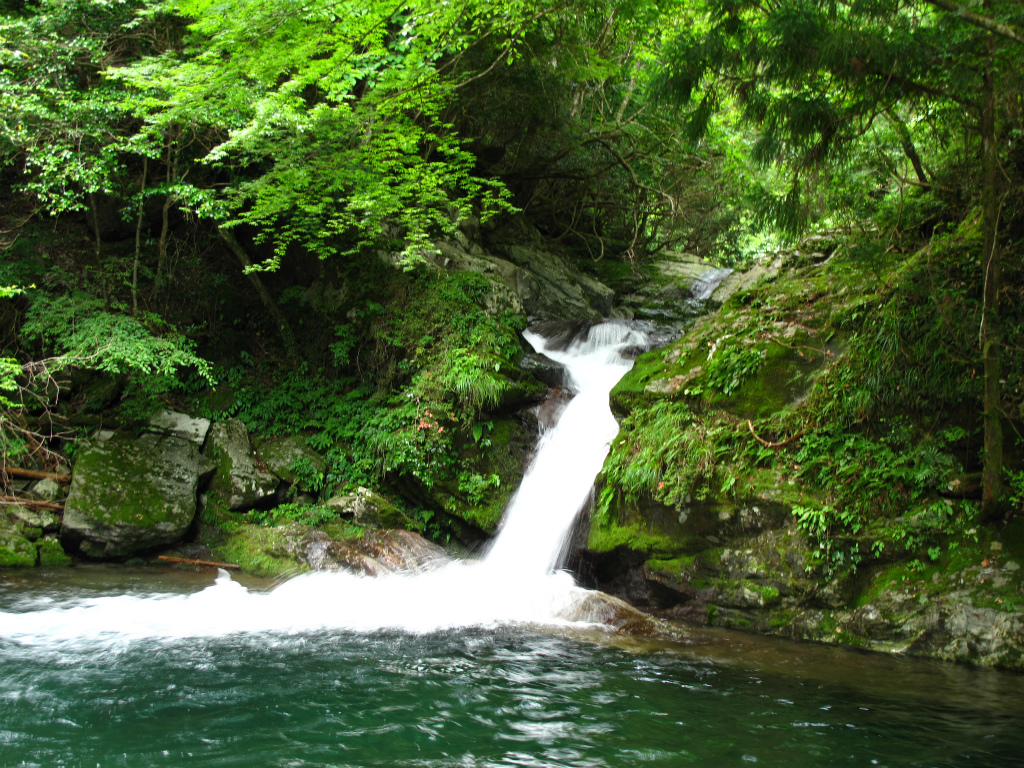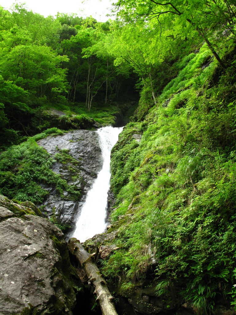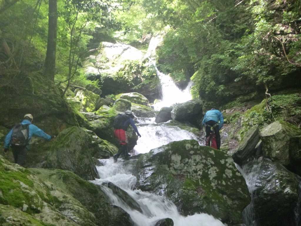 澄んだ深緑の大きな釜も持つ4m滝からは、立派な釜を持つ斜瀑が次々とあらわれ左右にかわしたり登ったりしながら進む。滝の大きさからして大ぶりで深い釜が目立ち、水量はもともと多いのだろう。自然林と整備された植林におおわれ苔生した岩がそこかしこにある豊かな谷のようで、見ているだけで癒される。特に末広がりに流れる8m斜瀑は深い森から直接流れ込むような感じでいい。