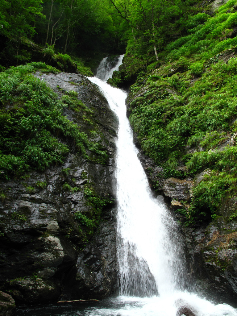 大岩が目立ちゴーロを越え、大きな瀑音に目を向けると緑の岩肌に一筆書きしたように流れ落ちる一ノ滝で下段15m滝と上段40mの末広滝が見えている。中段の滝がかくれているようで、3段60m滝になる。