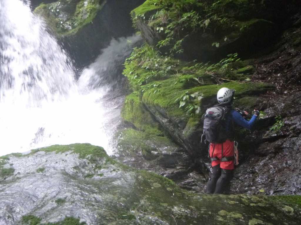 そして今日のハイライト三ノ滝が待っていてくれた。緑におおわれた谷がゴーロ状に高度を上げ先に行ってもらったパーティが見え出すとその奥に絹の衣のように落ちる三ノ滝が見える。幅広に落ち岩肌にあたることで様々な景色をつくりミストが漂っている。緑の岩肌が透けて見えるので、水流を見ていて飽きない。「こんなきれいな滝が身近にあったんや。」と思わずつぶやく。胎内くぐりができるようなので、くぐると冷たさとヘルメットに落ちる水音がやたらとうるさかった。