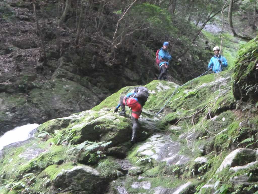 先行パーティが右岸の巻きにかかるが、途中でロープを出している。我々は、少し下流にもどり、植林の尾根のひとつ上流側の小尾根に取りつくと細いワイヤーが垂れていた。この急斜面から植林に入り登山道に上りつく。先行パーティも同時に着き、結局は同じ場所に上らされる。先行パーティはここで下山したようだ。
