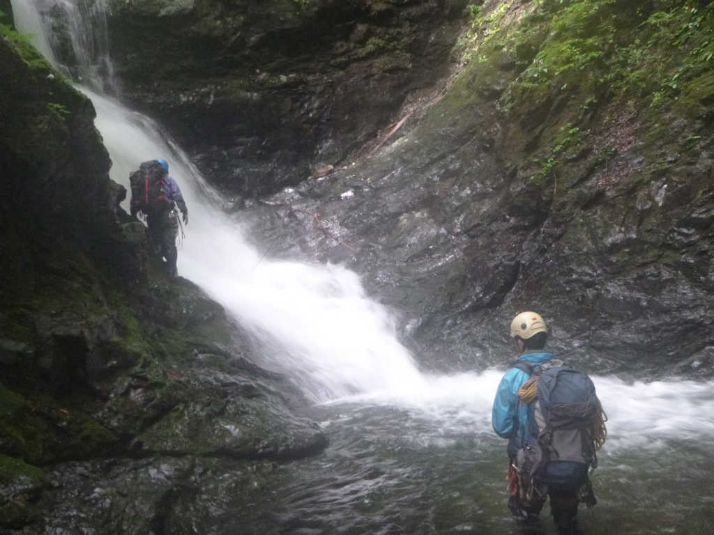 仙人滝の上の方の流れを横切るたろーさんの姿が見えた。「し、進化している」。進化した沢サイボーグ、たろーさんの姿だった。あんな増水した仙人滝を横切るなんて、並の人間にはできない。