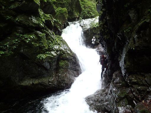 ついで、仙人滝のゴルジュ。暗いゴルジュの右上から増水した水が流れ込んでいる。ここは当然巻きでしょうと思ったら、たろーさんが様子を見てくると言って泳いでいく。滝左の岩に乗って様子を見ている。そのうち、サブリーダーのmichiさんを手招きして呼び寄せる。二人で何やら相談していると思ったらたろーさんが動き始めた。えっ、進むの?この仙人滝のゴルジュ、面白いところです(^^)。楽しませてくれるところですね。