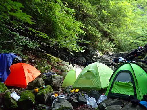 ここはいいところだけど、 タープ張って雑魚寝ならなんとか7人でも寝れるけど、自立テント(!)が多いとちと辛いかな。大人数なら、黒滝(釜?)谷出合下右岸あたりが、絶好のテン場。二泊三日でなら、次のテン場は源流のテン場とゆっくり廻られるのがいいかと。