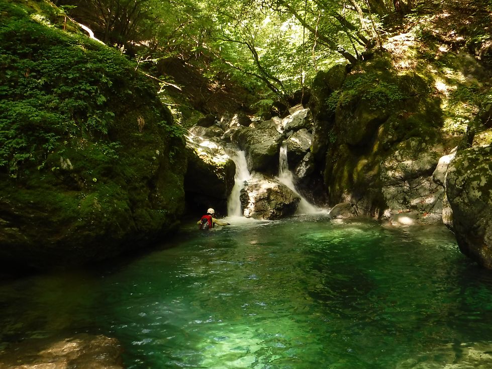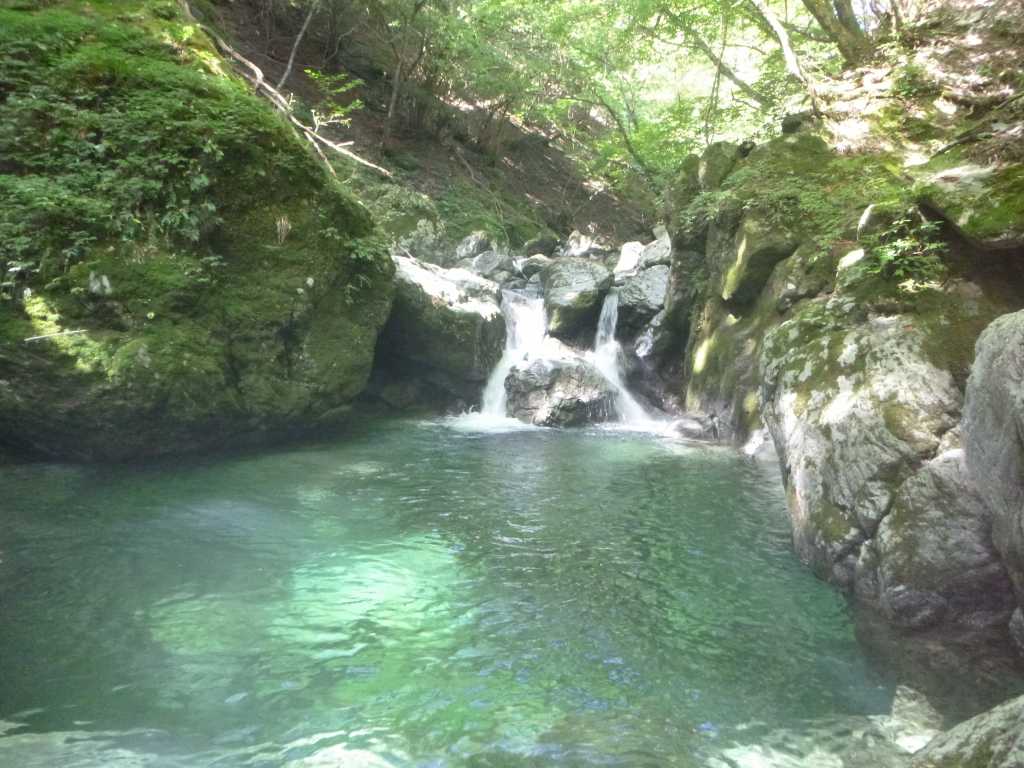 万才橋から入渓し三条の滝の先、エメラルドグリーンの淵をシュークリームさんが泳いでゆく。