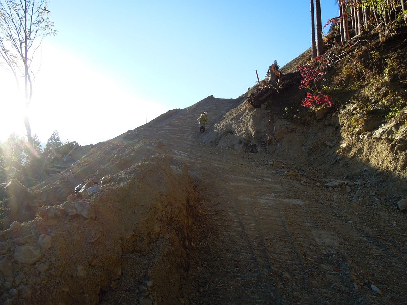 これではもう林道は通れなくなる?廃道にするのだろうか?法面工事用の作業場を盛っただけで法面工事が済んだら削り取るでしょう。