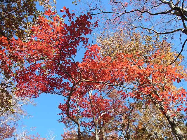 千秋林道を歩きだすと、雲ひとつない青空の元、色づいた桧塚が姿を現した。気持ちの良い日だ。うん。いい色合いです。