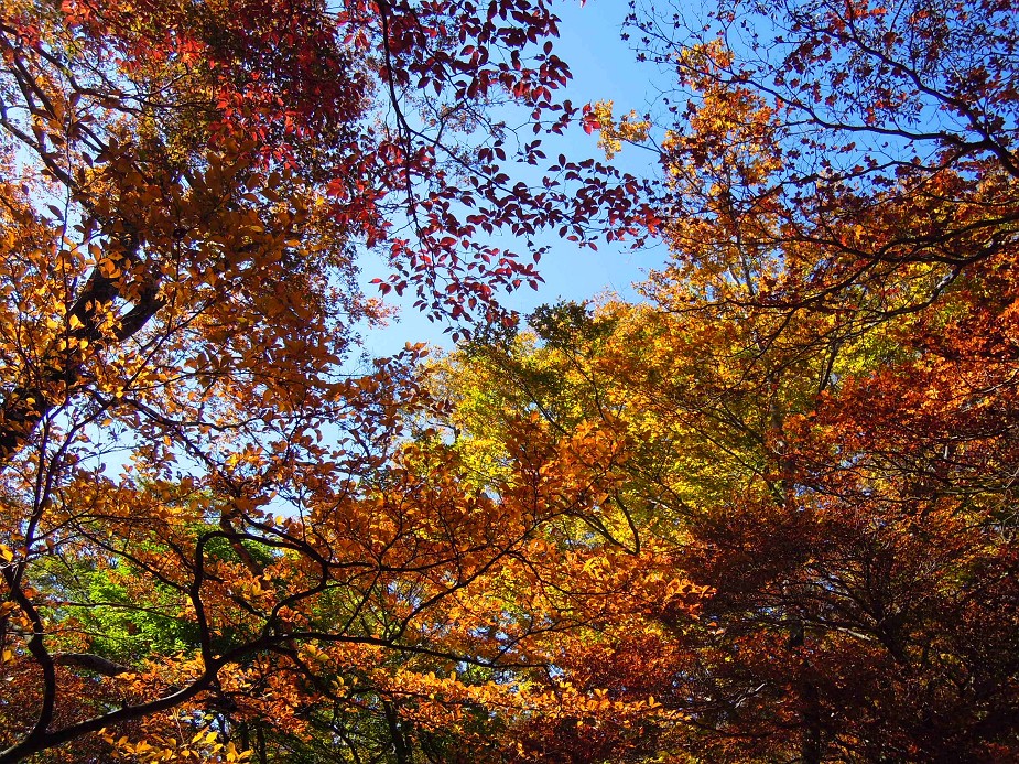 千秋林道を歩きだすと、雲ひとつない青空の元、色づいた桧塚が姿を現した。気持ちの良い日だ。