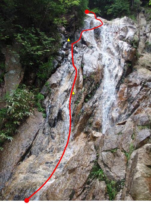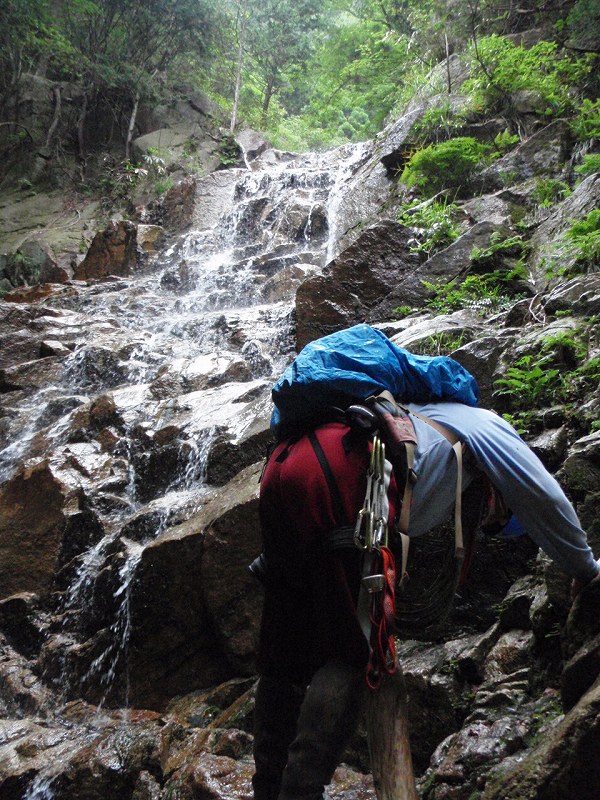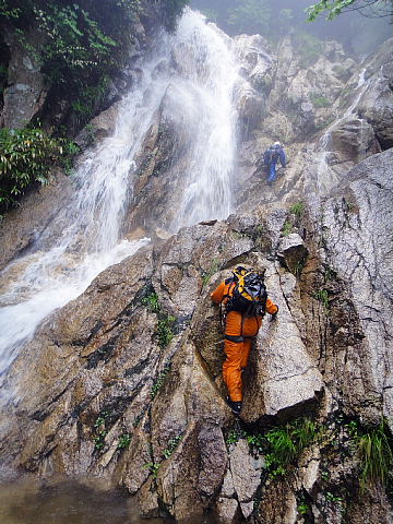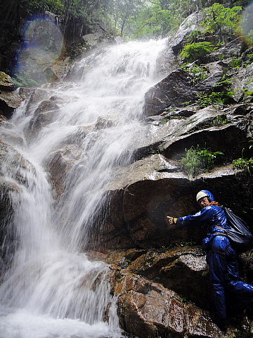 やがて右にルンゼを持つ13mの滝だ。ここはたしか上部に新しいリングボルトがビレイ点で設置してあるはずだ。といっても3年ぐらい前の時はピカピカだったが今はどうなんだろう。暗黙の了解で(笑)りゅうさんにトップを行ってもらうことにした。顔を見合わせるときには僕はすでに巨岩にシュリンゲ二本でアンカービレイを取って、ATCをぶらぶらさせ、ハーケンを手渡していた。ルンゼを行けばどうって事ないところだが、流芯の直登である。