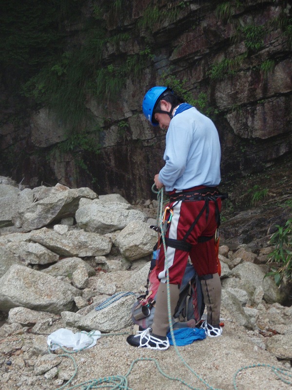 我々といえば、なんとかりゅうさんが、ハイカラな沢用のシャツを着ているぐらいで下は二人ともジャージに地下足袋。僕に及んでは上はユニクロの速乾性の長袖ポロシャツである。さらに年期の入ったヘルメットといういでたち、さらにさらに僕のジャージは渓流スパッツですそが絞られて土木作業員のニッカボッカみたいになってるし、最大の致命傷はどうも尻が破れてパンツがのぞいているらしい。