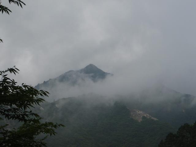 百間滝落ち口のナメに到着。足を延ばして座り込み、時折ガスの間からのぞく鎌ヶ岳の勇姿を見ていたら、