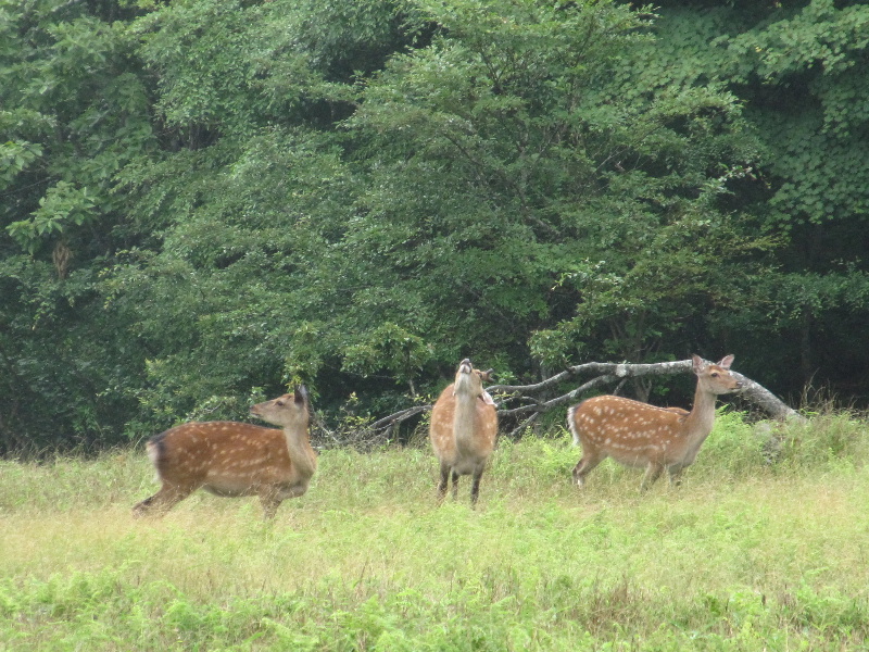 虫の攻撃に耐え昼食を取る、片付けるまもなく再びのスコールで慌てて合羽を着る、先ほどまで見えていたヒキウスは完全にガスの中となってしまった。酷くなる前に下山しようと桧塚に向かうと又晴れだしてガスの晴れ行く景色を楽しむ。笹原には鹿の群れが餌を食んでいる、見ていると可愛く尻尾をしきりに振っている、耳も動いているね、時折首を腹に廻したり、判ったあれは虫を追い払ってるのだ、ヤツらもブトに攻撃されるのだろう夜も辛いだろうなと鹿の気持ちになったのだ。 ヌタハラ林道へのコースを降りていく最後の植林道ではヒル長靴に付いて来る、雨をもらったから元気づいたのか、歩いているのにどうやって取りつくのだろうと止まって見た、あちらこちらに沢山居るではないか靴に登ってくるのを眺めてたらもう片方はもう上まで来ているよ早いんだね。慌てて弾き飛ばして歩き出した。植林小屋は又使うのだろう新しいトタン板を張っている、間伐作業でもするのだろう。