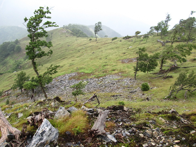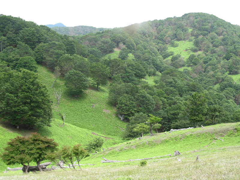 疲れ気味でヒキウス平に上がった、奥峰には人影は無いようだ。セミの声と濃くなった緑がまぶしい、これで虫がいなけりゃ最高なんだけど、落ち着かないままP1394へここでパンを頬張る、時間は11時だ薊岳までは到達できる時間ではないが途中の二重山稜のコバ地辺りまで行きたいなと明神岳方向に向けて歩き出す。そこで今日はじめての人に出会う、若いカップルだ奥峰に行くのだろうか地図を広げて確認していた。