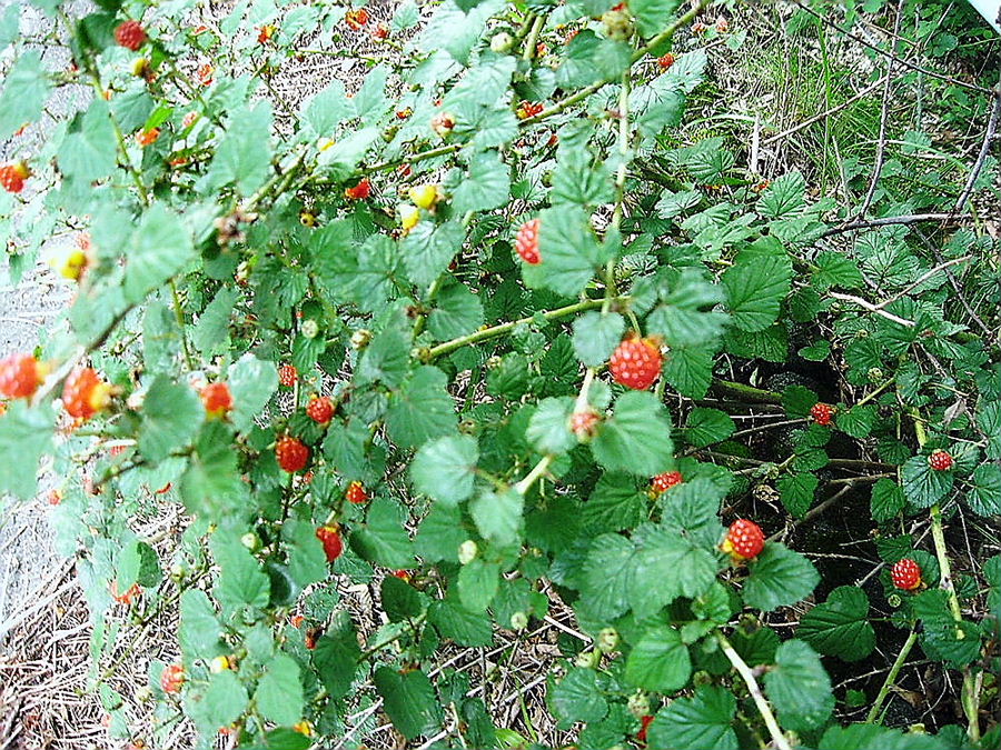 道端のヤブイチゴは熟れて食べごろだよ、甘いわ